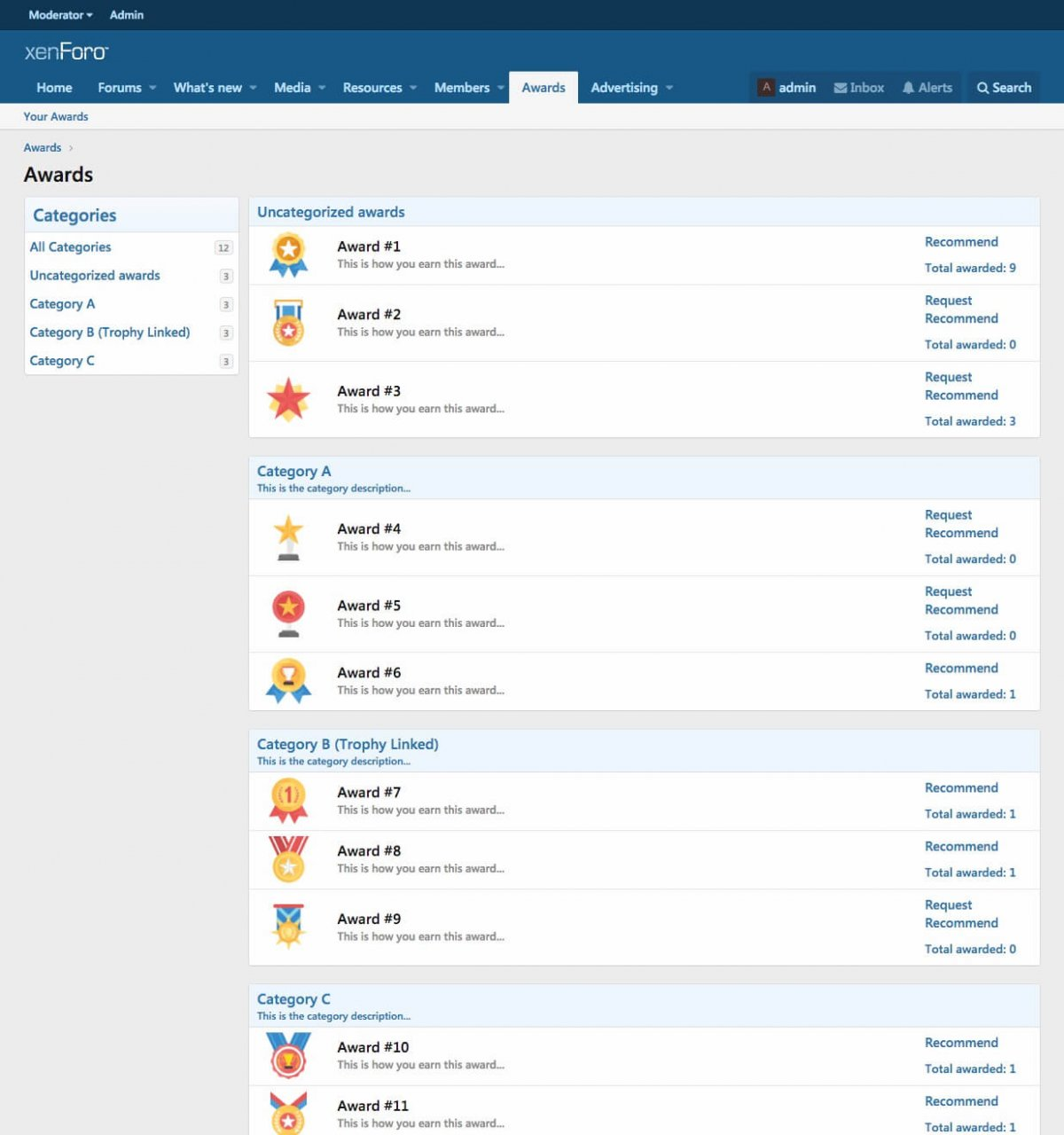 - Режим отображения postbit в карусели: Отображение наград postbit в карусели с автоматическим переключением. Теперь это режим по умолчанию, но его можно изменить с помощью свойств стиля в AdminCP