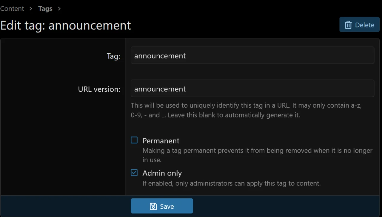 - Ограничивает использование отдельных тегов только администраторами на отдельной странице административной панели или в форме редактирования тегов.
