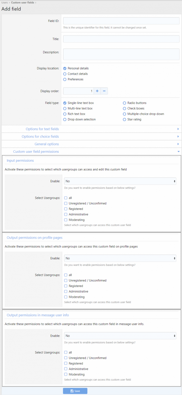• Разрешения на ввод: выберите, какие группы пользователей могут получать доступ к пользовательскому полю и редактировать его (поддерживает 3 исходных местоположения).