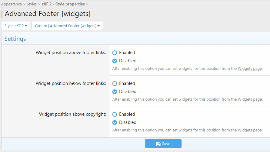 - включить положение виджета нижнего колонтитула в свойствах стиля и добавить любой виджет, который вы хотите со страницы виджета