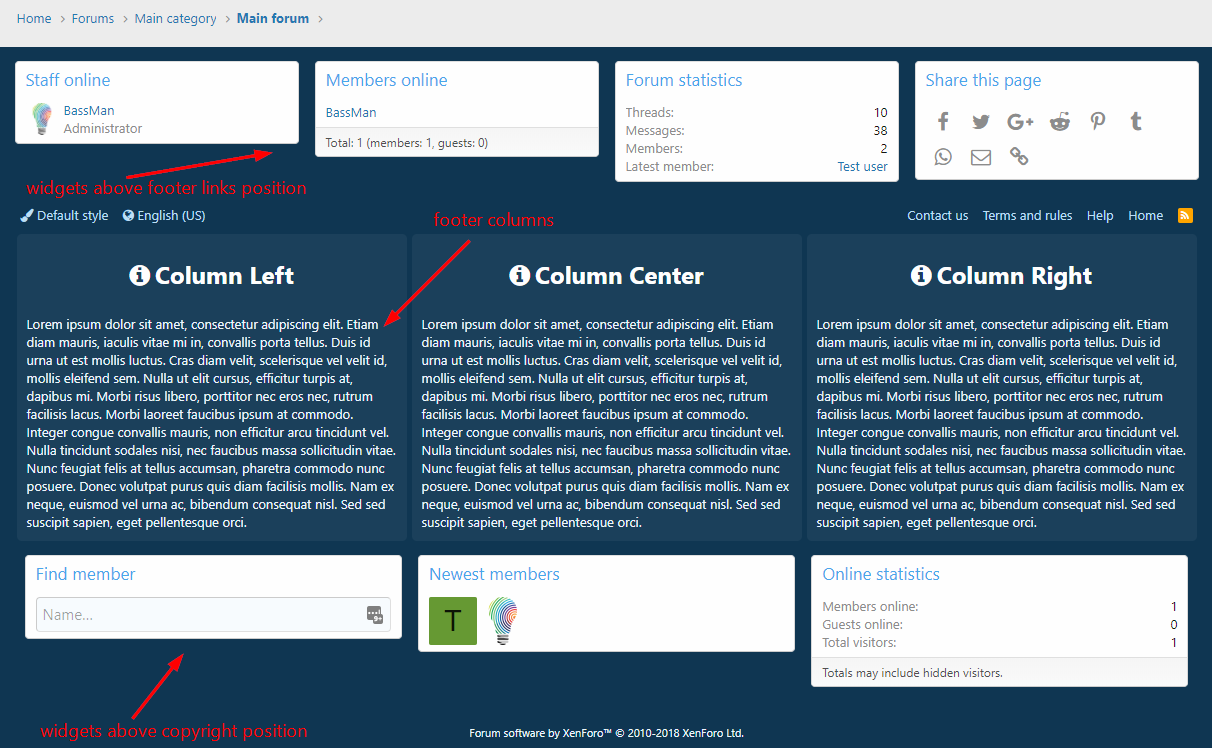 - 3 позиции виджета нижнего колонтитула (над ссылками нижнего колонтитула, под ссылками нижнего колонтитула, выше авторских прав)