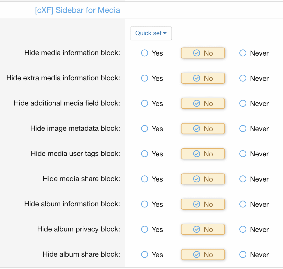 - права группы пользователей для блоков боковой панели мультимедиа: