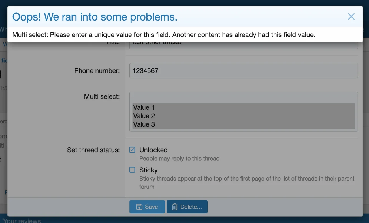 - Перейдите в AdminCP -> Выберите нужное пользовательское поле -> Выберите опцию "Поле является уникальным".
