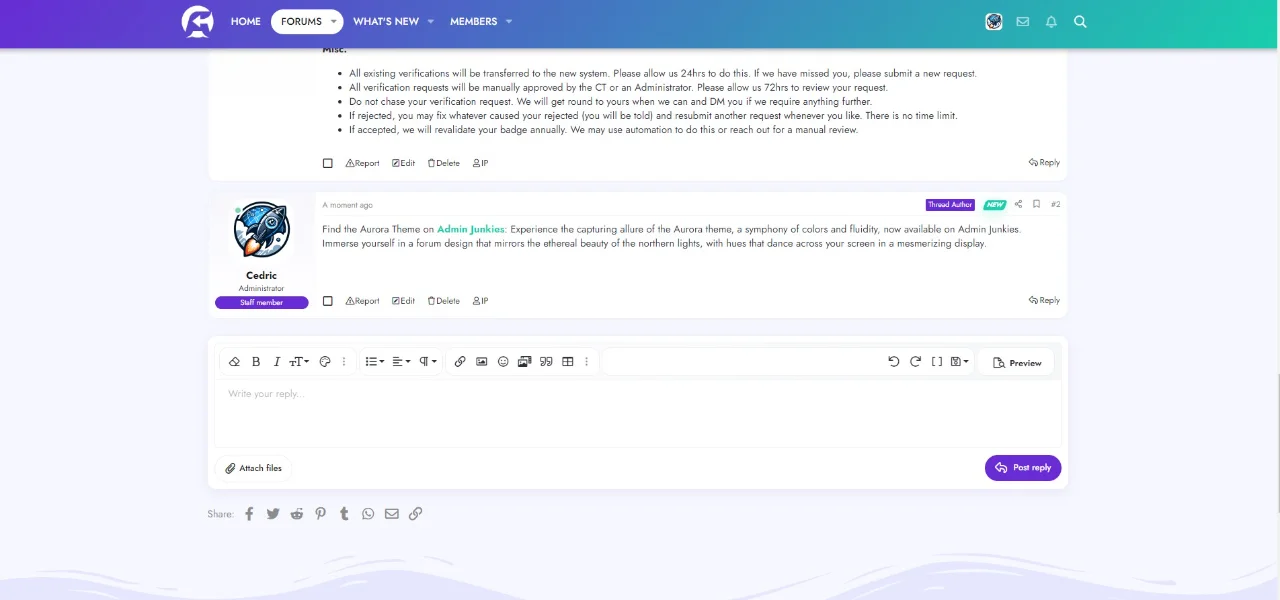 Оригинальная тема Aurora устанавливает стандарты элегантности и функциональности в дизайне форумов. Она идеально подходит для форумов, которым нужен яркий, визуально привлекательный интерфейс. Эта версия может похвастаться всеми фирменными функциями Aurora, включая настраиваемый фон узлов, форму аватара, сообщения для гостей и многое другое, в классической, завораживающей цветовой палитре.