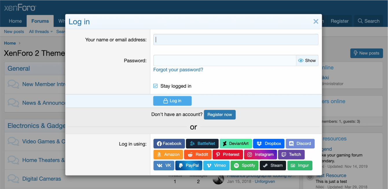 Плагин позволит Вашим пользователям входить на форум, с использованием таких сервисов, как BattleNet, DeviantArt, Dropbox, Discord, Amazon, Reddit, Pinterest, Instagram, Twitch, VK.com, PayPal, Vimeo, Spotify, Steam и Imgur.