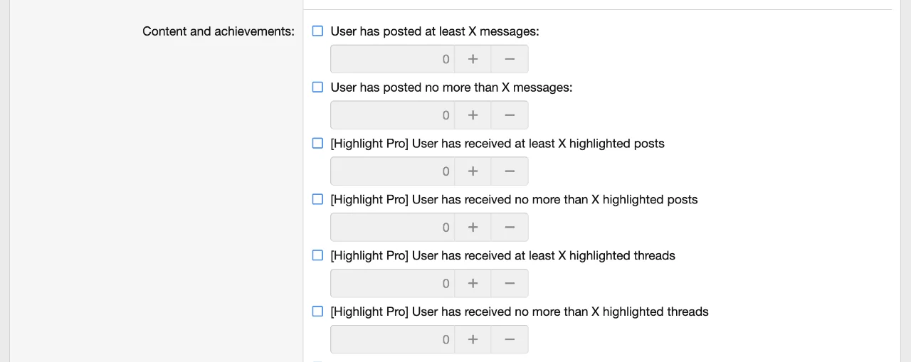 - Добавляет критерий пользователя «Пользователь получил не менее X выделенных тем»