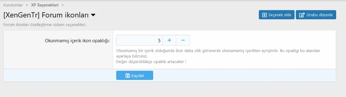 - Admincp >> Настройки >> Параметры XF >> [XenGenTr] Значки форума >> Непрозрачность значков непрочитанного содержимого