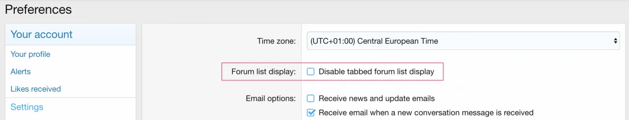 - Пользователи могут отключить отображение списка форумов с вкладками через настройки, если это разрешено (на основе разрешений)