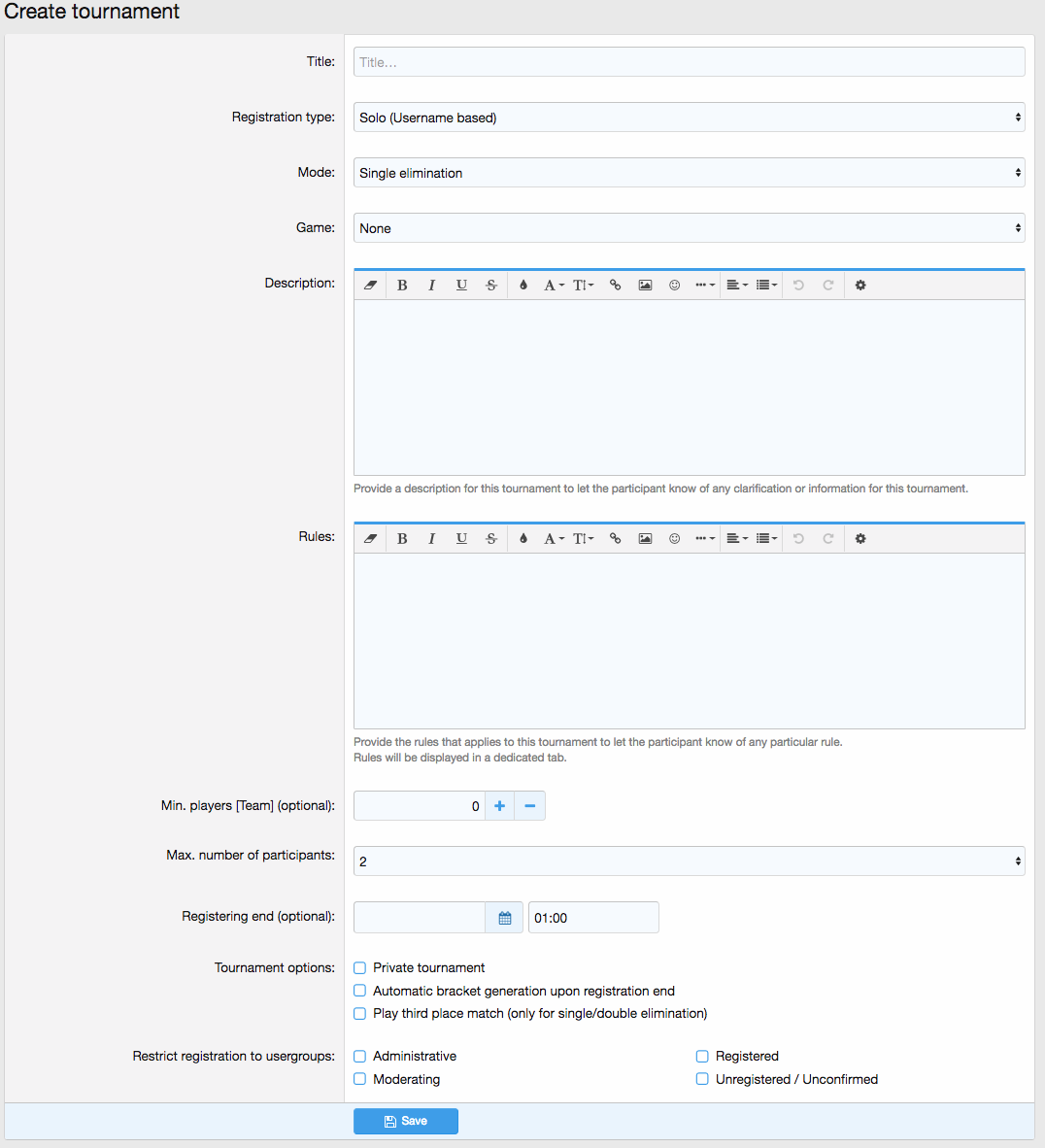 - Приватные/публичные турниры, которые могут создавать администраторы и пользователи. При этом возможно полное управление турниром — например, инвайт или удаление пользователей.