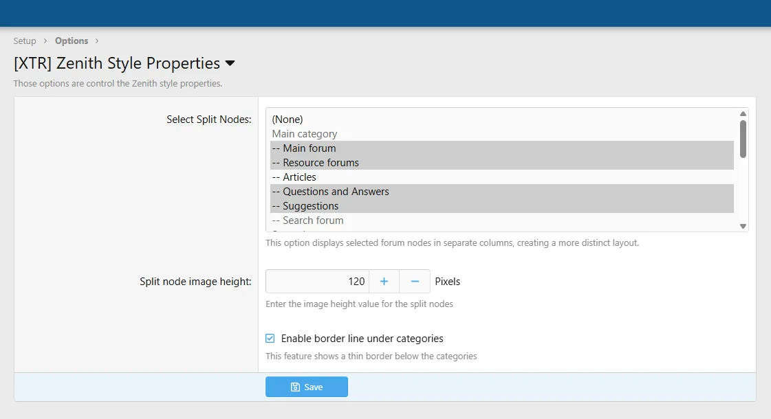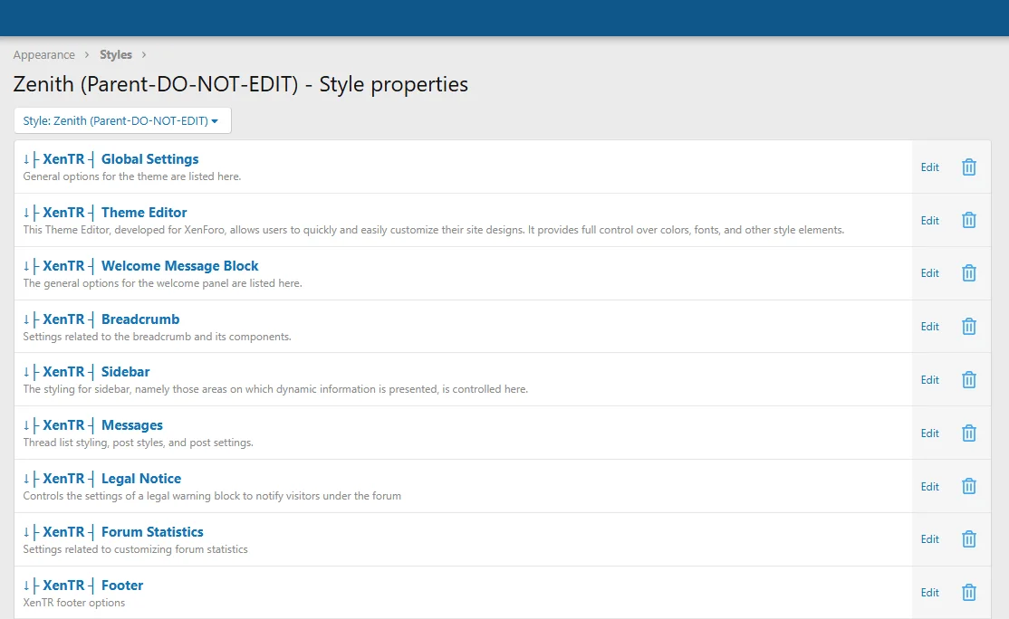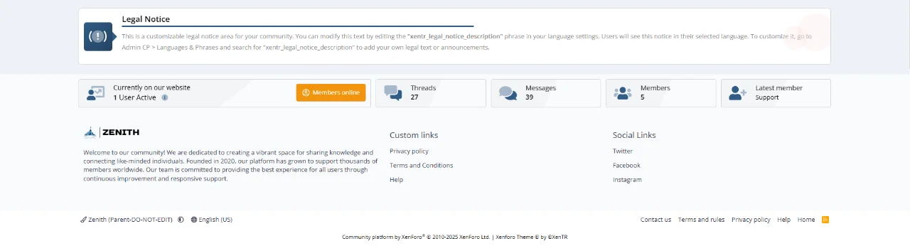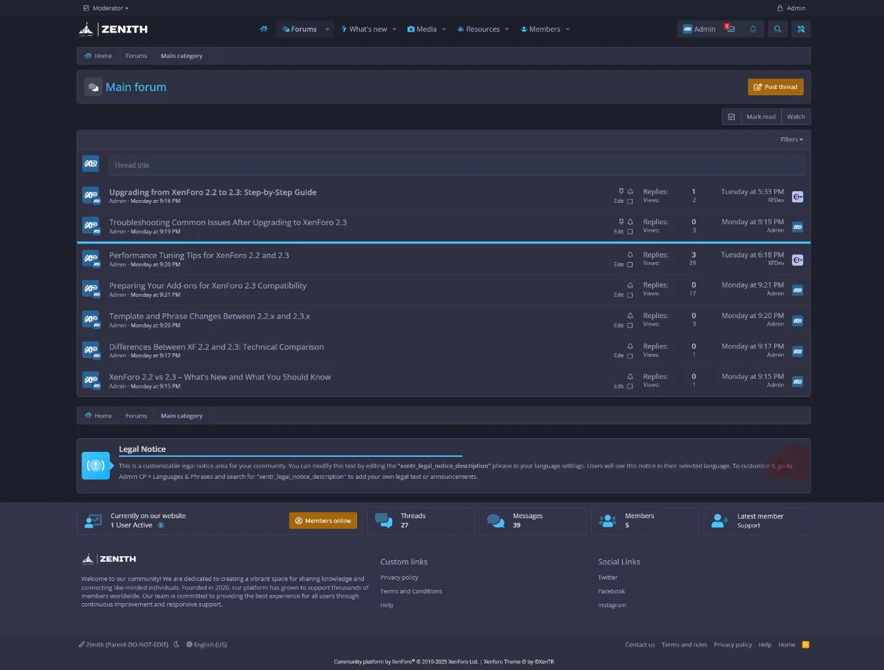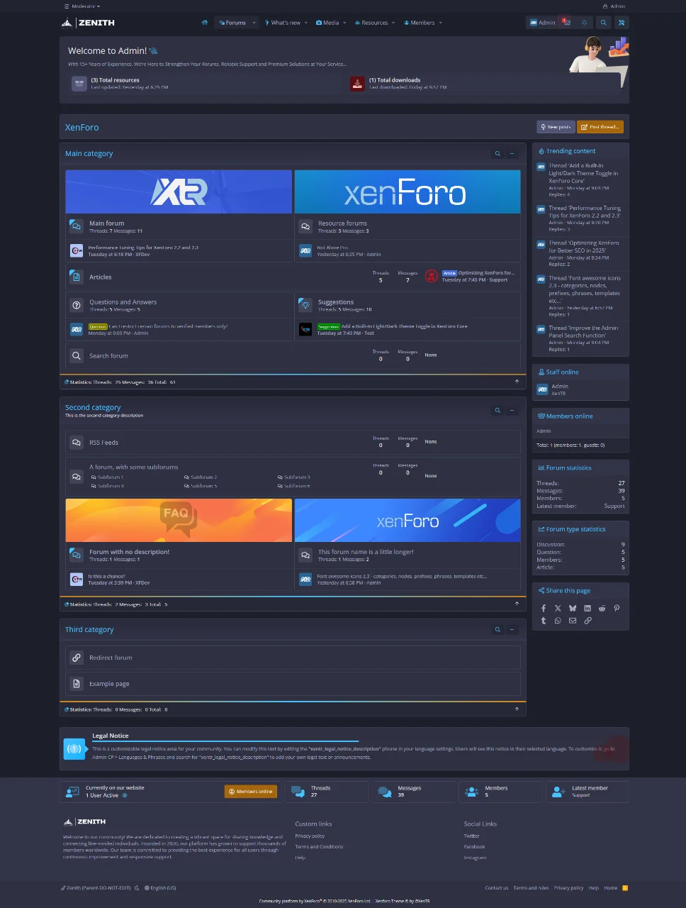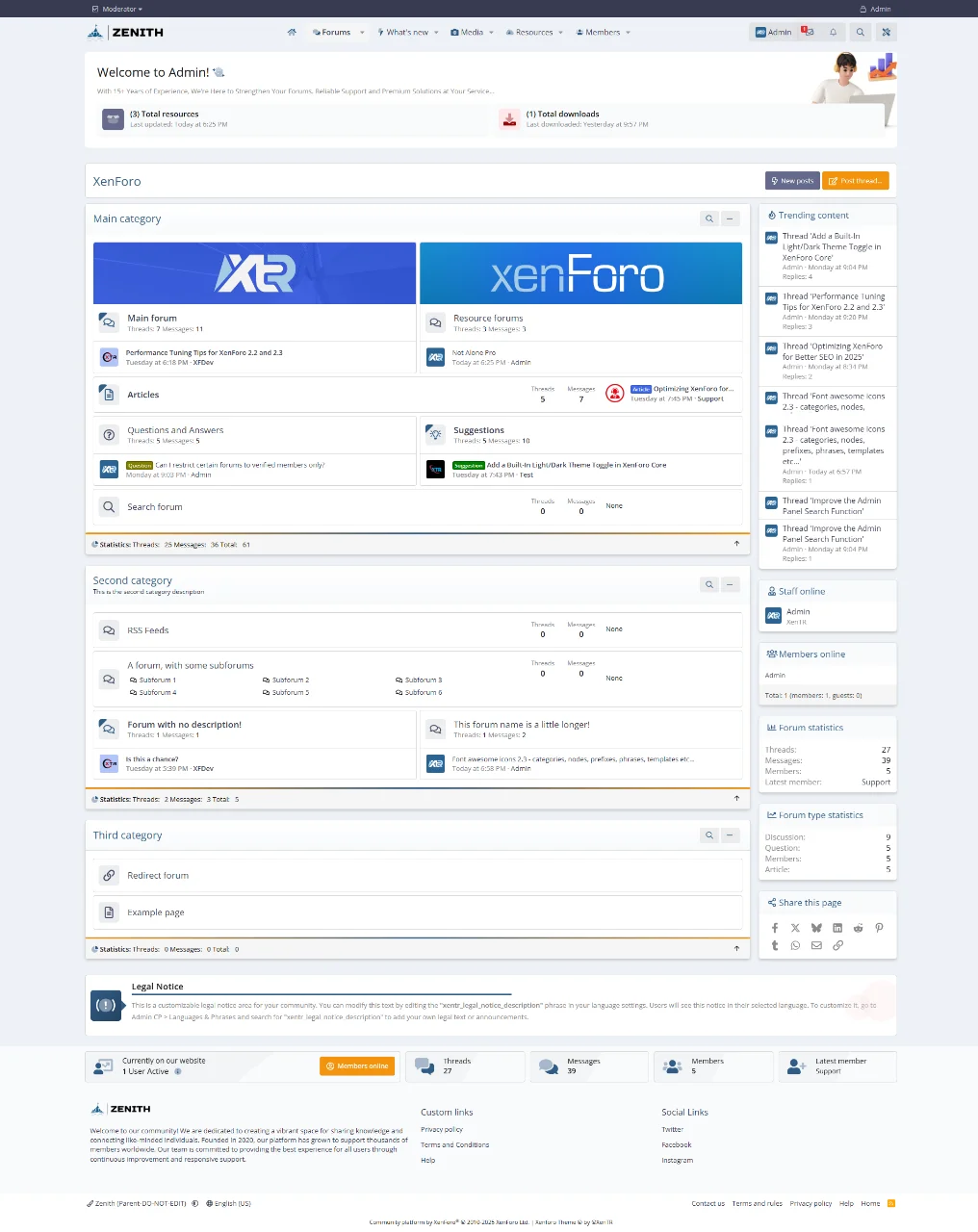 Zenith прекрасно работает с панелью администратора XenForo. Настройки темы, глобальные настройки, приветственное сообщение, навигационная цепочка, боковая панель, сообщения, юридические уведомления, статистика форума и нижний колонтитул легко настраиваются. Эта гибкость позволяет администраторам настраивать форум именно так, как им нужно.