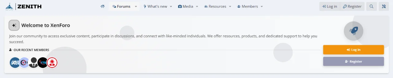 Zenith предлагает привлекательный дизайн главной страницы для новых пользователей. Он включает такие элементы, как значок ракеты, и лаконичный дизайн, которые создают профессиональное впечатление у посетителей. Информация о последних участниках и функции входа/регистрации стимулируют взаимодействие с пользователем. Приветственный экран производит приятное впечатление при первом знакомстве с форумом.