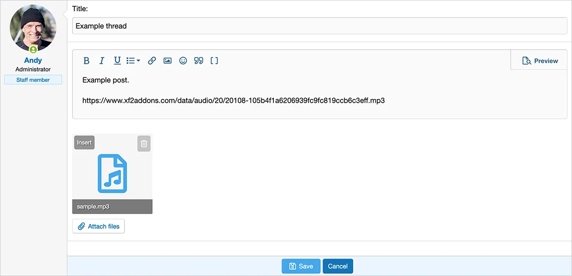 • Вставьте URL-адрес в сообщение, и аудиоплеер будет встроен.