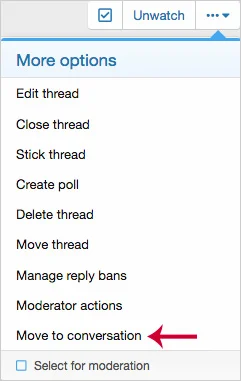 Это дополнение позволит сотрудникам легко перенести тему, начатую на форуме, в беседу. В беседу будет добавлен ответ, указывающий, что тема была перенесена в беседу.