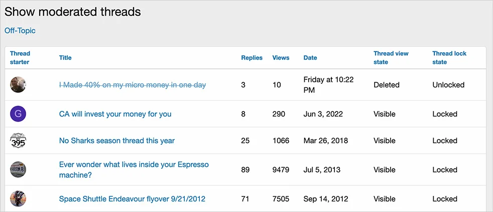 Это дополнение позволит модераторам форумов быстро просматривать, какие темы были модерированы на форуме, который они просматривают.