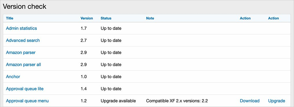Проверяет дополнения, разработанные XF2 Addons, и сообщает, нуждаются ли они в обновлении.