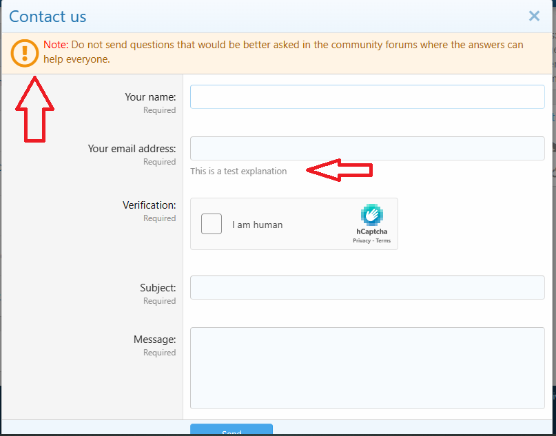 Простое дополнение, которое добавит уведомление в форму обратной связи с нами. Оно также добавляет поле с пояснениями в поле электронной почты.