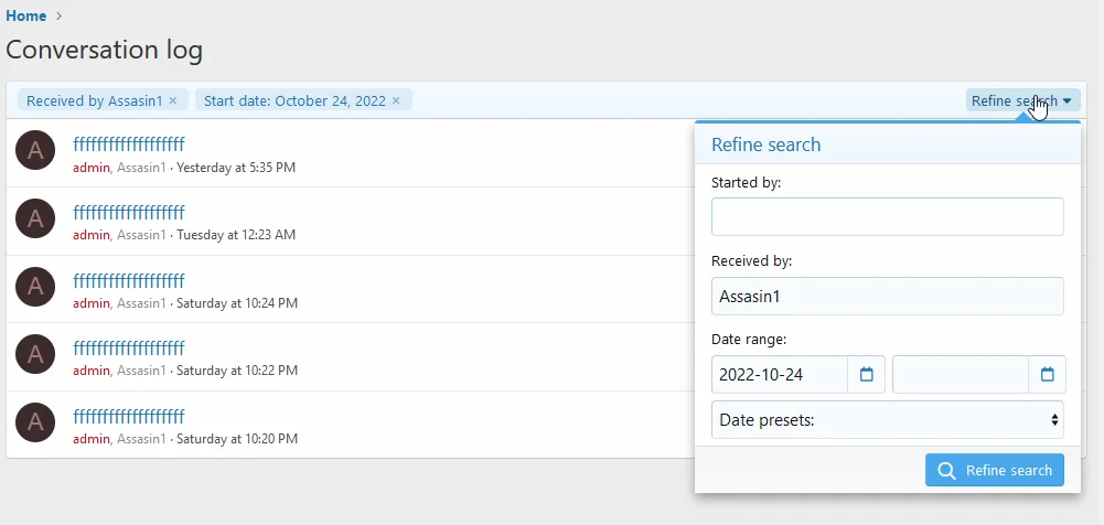 - Страница с любыми разговорами пользователей с диапазоном дат, фильтрами отправителя и получателя