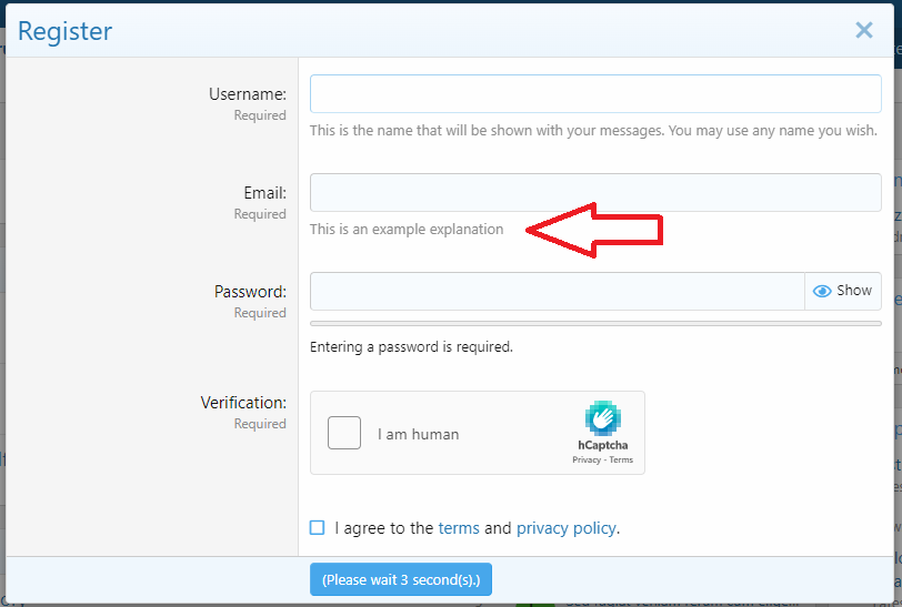 Простое дополнение, которое добавляет пояснение под полем электронной почты в регистрационной форме. Это настраивается в настройках дополнений.