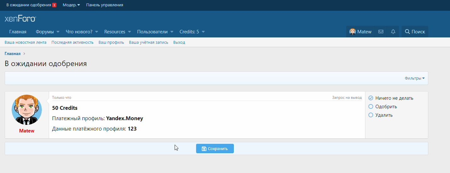 - Одобрение или отклонение заявок на вывод через стандартную систему модерации контента XenForo.