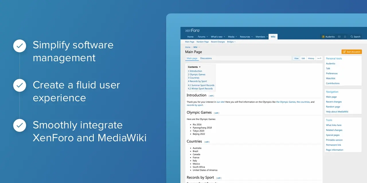 XWiki объединяет XenForo и MediaWiki, что упрощает управление вашими программными системами и упрощает взаимодействие с пользователем. Устраните некоторые проблемы, связанные с управлением двумя отдельными платформами, синхронизировав и включив несколько компонентов MediaWiki и XenForo. XWiki может помочь улучшить платформы.