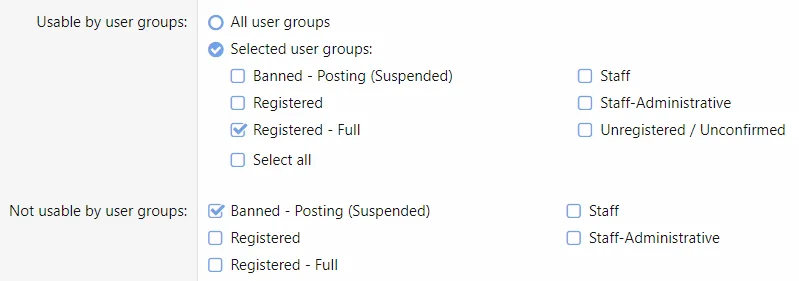 Это дополнение позволяет вам выбирать группы пользователей, которые могут приобретать каждое обновление. Пользователь должен состоять по крайней мере в одной из разрешенных групп и не должен входить в группы "запрещено". В противном случае обновление не будет для них доступно.