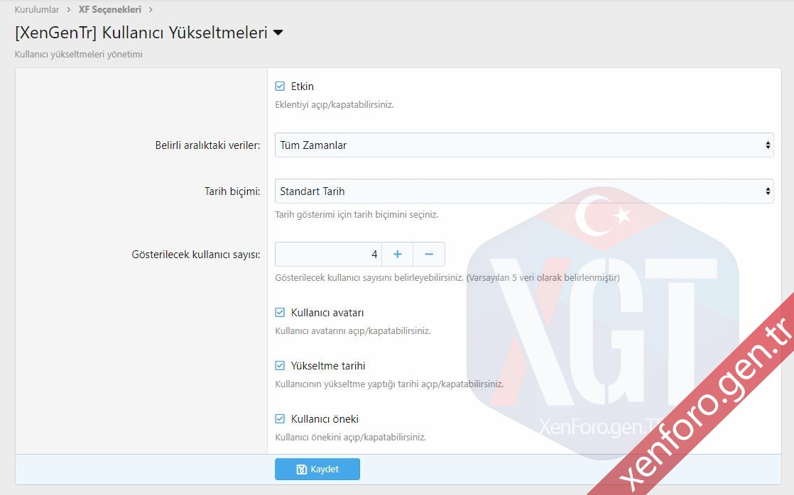 Вы можете активировать и настроить плагин из Admincp - > параметры XF - > [XenGenTr] его Kullanıcı Yükseltmeleri.
